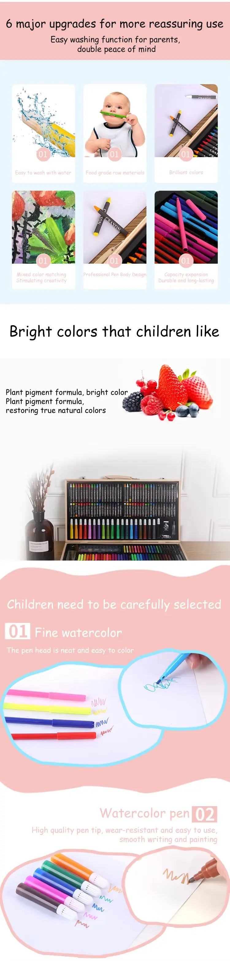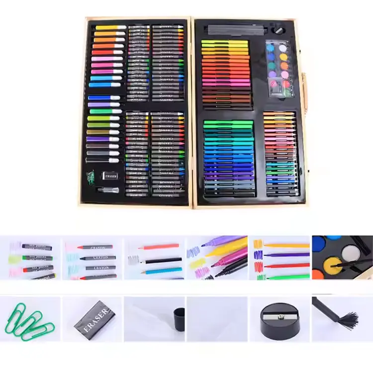 *내부 항목: 40 개의 컬러 크레용, 40 가지 색상 유화 스틱, 종이 클립 지우개, 샤프너, 눈금자, 연필, 페인트 브러시, 12 컬러 파우더, 35 슬림 줄기 수채화 펜, 20 개의 컬러 리드.
