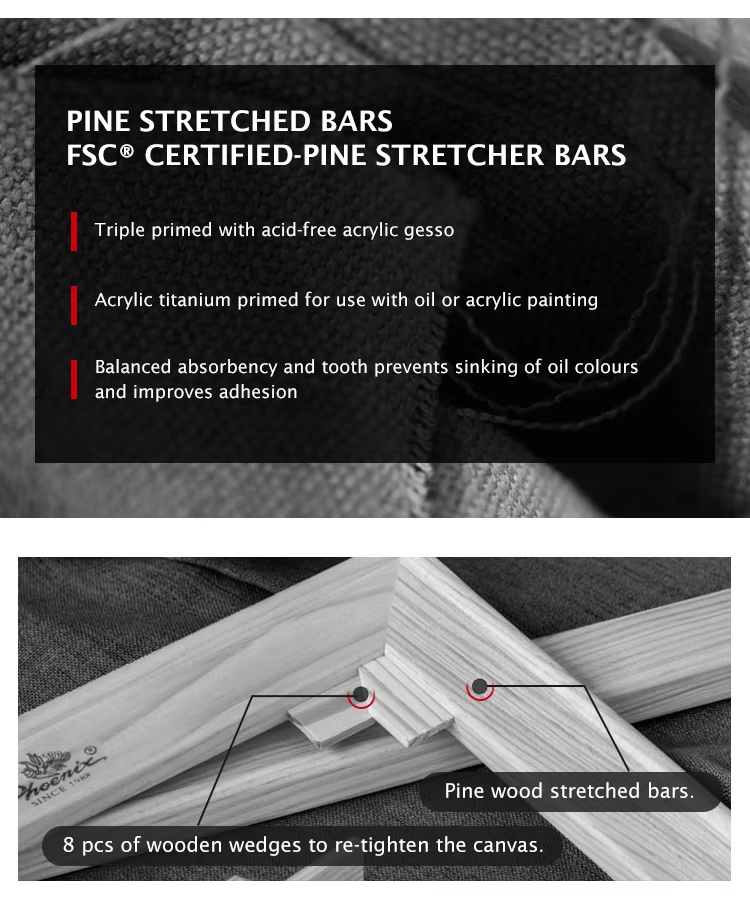 ● 오랜 시간 내구성 :가마 건조 된 소나무 프레임은 30% -70% 습도 환경에서 뒤틀림에 저항합니다. 이중 프라이드 표면은 유성 페인트, 아크릴 페인트 및 블리드 스루없이 혼합 매체를 허용합니다.