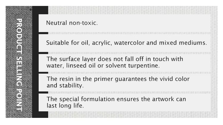● 색상 성능 :우리의 예술 캔버스에서 진정한 색상을 경험하십시오. 산이없는 코팅은 50 년 이상 안료 무결성을 유지하면서 황변을 방지합니다. 평범한 캔버스와 비교할 때, 우리는 실험실 테스트에서 20% 더 풍부한 색 깊이를 보여줍니다.